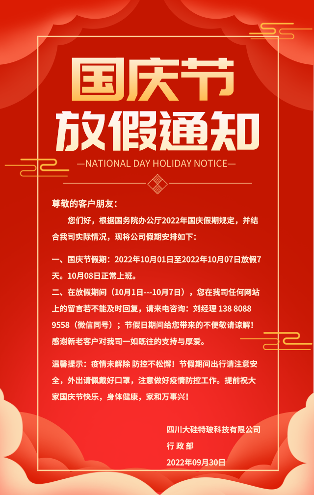 四川大硅特玻科技劉總攜公司全體員工提前祝大家國慶節(jié)快樂,生活幸福,身體健康,家和萬事興!